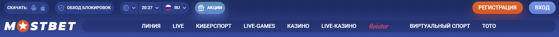 В верхней панели собраны кнопки быстрого доступа к основным разделам Mostbet: