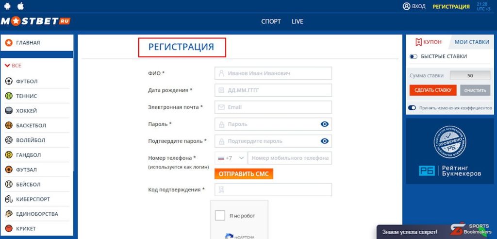 В левом вертикальном меню представлен полный список дисциплин: футбол, баскетбол, хоккей, теннис, волейбол, регби, бокс, единоборства, бейсбол, флорбол, крикет, гандбол и многие другие. Для оформления ставки достаточно выбрать интересующее событие и кликнуть по коэффициенту — система автоматически добавит его в купон, расположенный в правой части экрана.