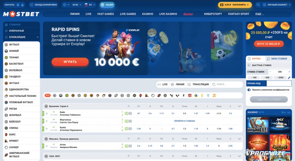 Центральная область отведена под Live-линию с актуальными матчами и трансляциями. Принимаются ставки на десятки дисциплин: футбол, теннис, баскетбол, хоккей, регби, бокс, единоборства, футзал, крикет и многое другое. Над линией расположен слайд-бар с анонсами ближайших турниров, повышенных коэффициентов, а также промо с фриспинами и бонусами для новых и действующих пользователей.